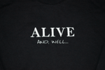 Front graphic uses punctuation to make a play on the classic phrase "Alive and well" and the 3 embroidered graphics mirrored on the sleeve: a cigarette, a broken bottle, and a razor blade, further enforce the new sardonic tone.