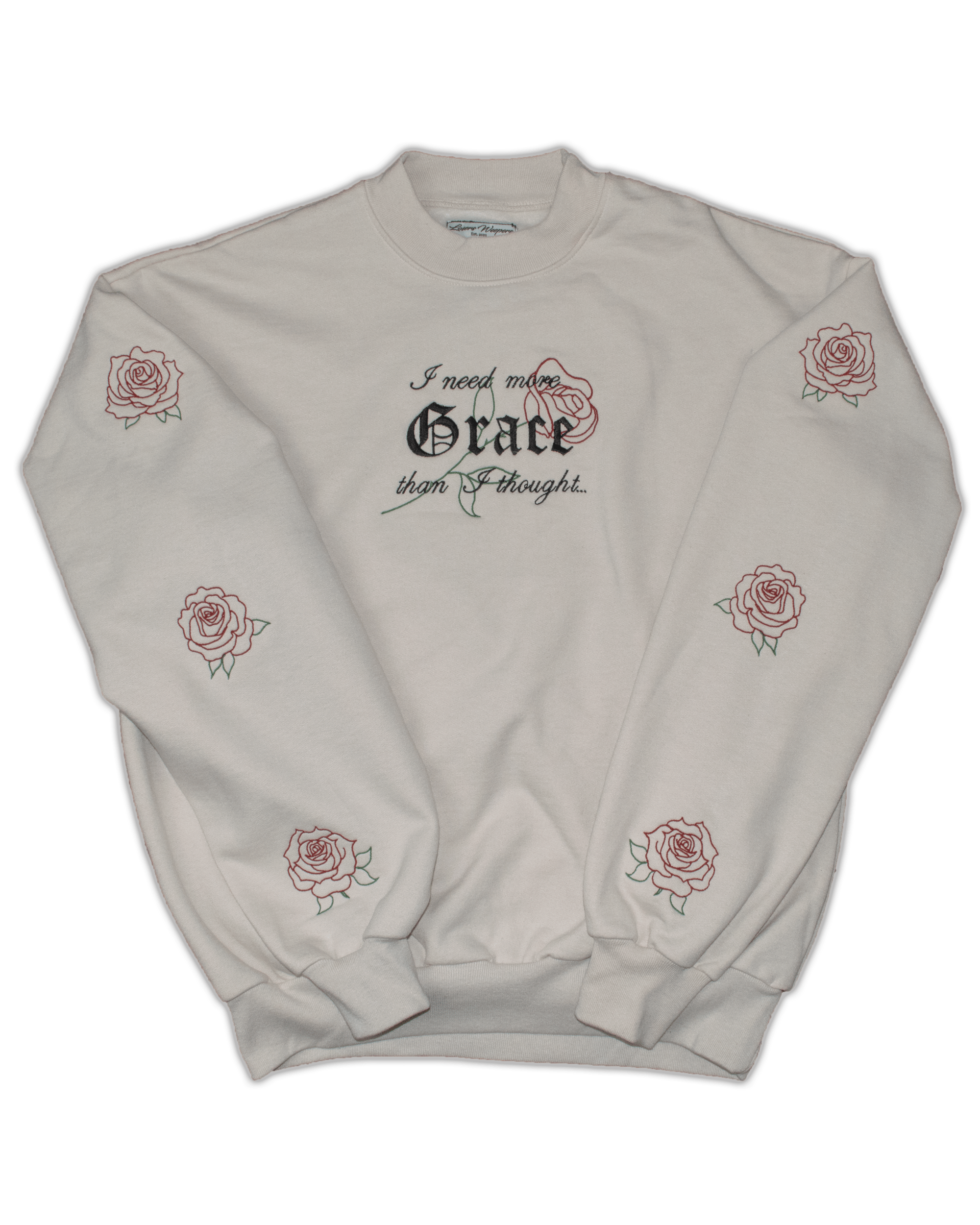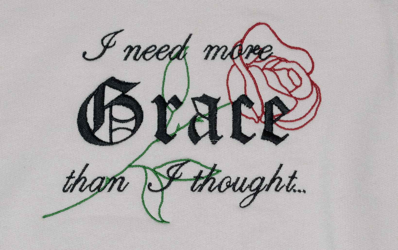 This pullover sweater features the final two lines of the poem over a minimalist embroidered rose. 3 unique minimalist rose blossoms are mirrored down the sleeves for a total of 7 different embroideries on a the single pullover. The off-white coloring and minimalist graphics manage to make it a stand-out piece while still remaining subtle and elegant.