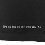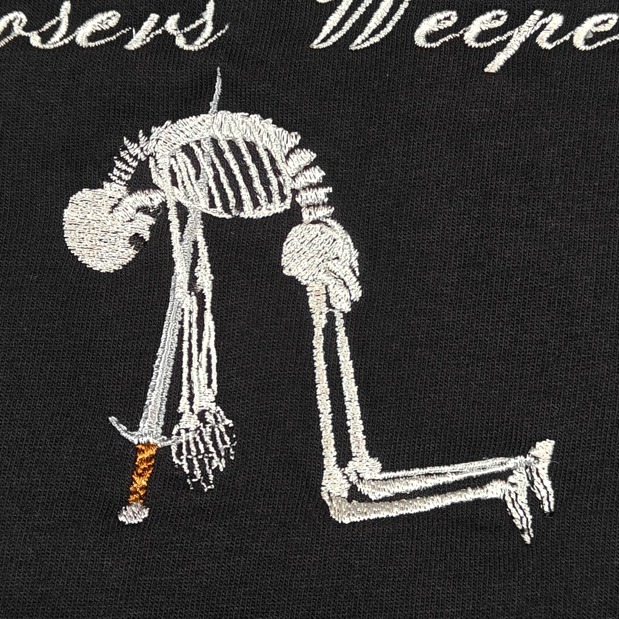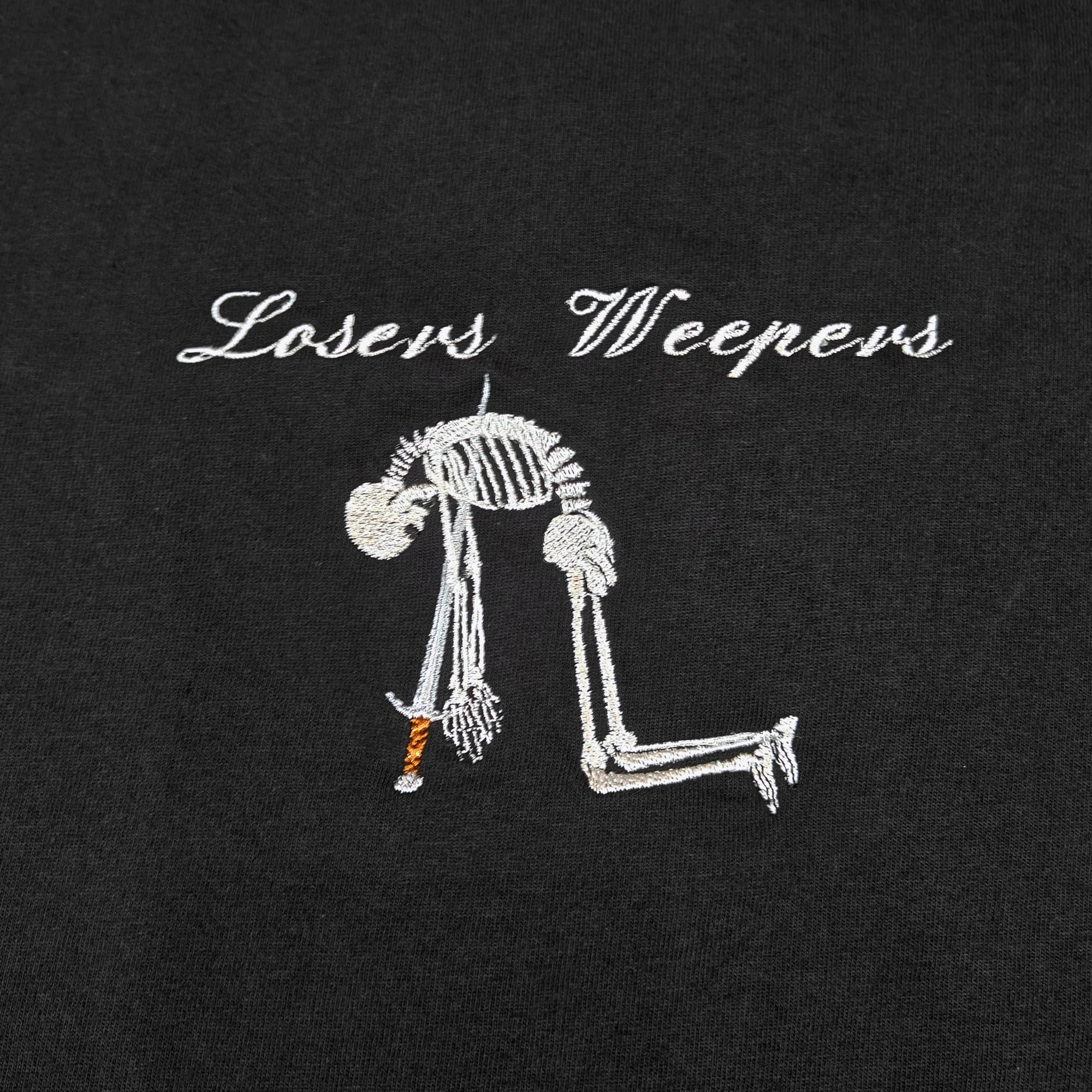 100% cotton T made in the USA. Features custom impaled skeleton embroidery under the Losers Weepers wordmark on the front. The rear features a subtle embroidery of the phrase "we all fall on our on own swords". Losers Weepers custom tag on the neck. Size tag on hem.